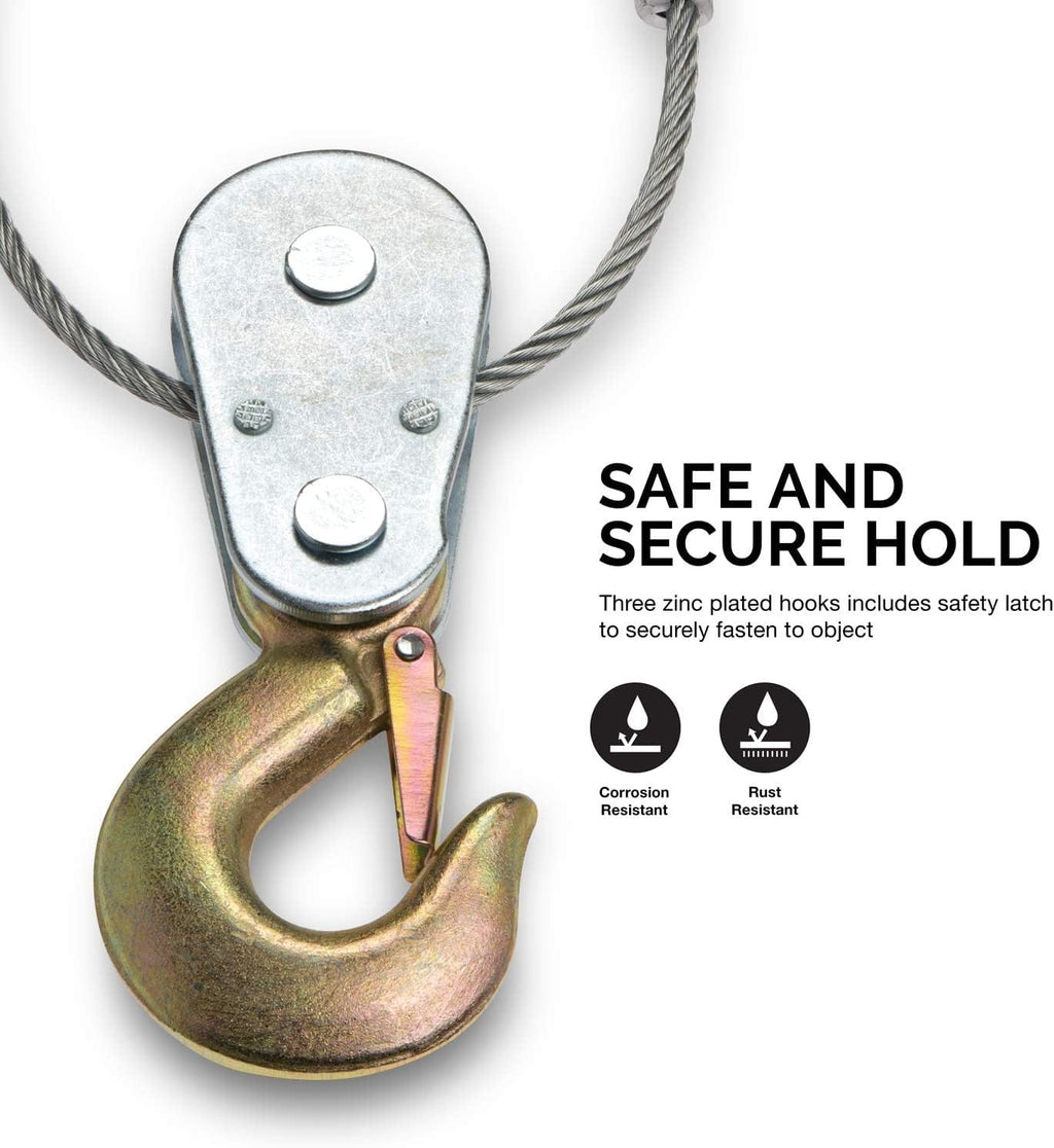 - WINCH HOOK: Heavy duty puller steel construction for added durability; hooks and gears are zinc plated for a long-lasting life in your garage or workshop when pulling, dragging, lifting, or stretching. Safety latch on all hooks to prevent accidents or slipping off.