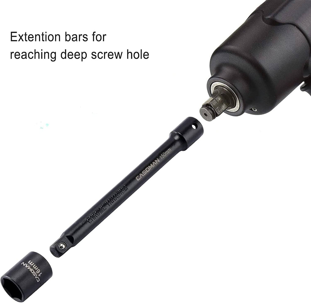 The CASOMAN 18-Piece Professional Socket Accessory Set is Made from Heavy-duty Chrome-Vanadium steel alloy (50BV30) with a corrosion-resistant black phosphate finish, providing the durability for a hard use. Get the most out of your sockets by purchasing the perfect complete set for them. It comes with a durable blow-molded carrying case for easy transportation, and quick organization.