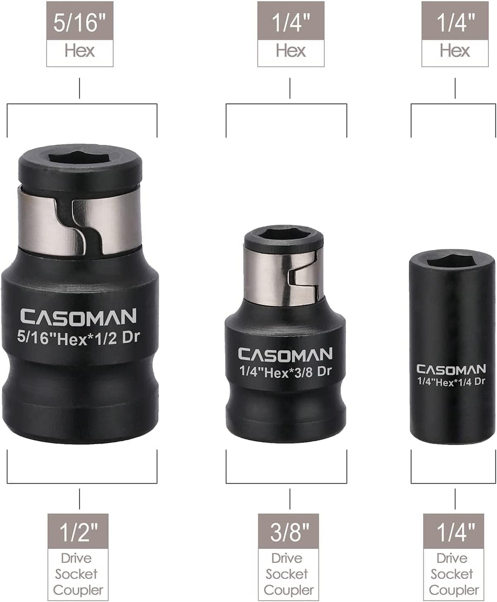 3 pc of Impact coupler :1/4"Hex*1/4"Dr, 1/4"Hex*3/8"Dr, 5/16"Hex*1/2"Dr