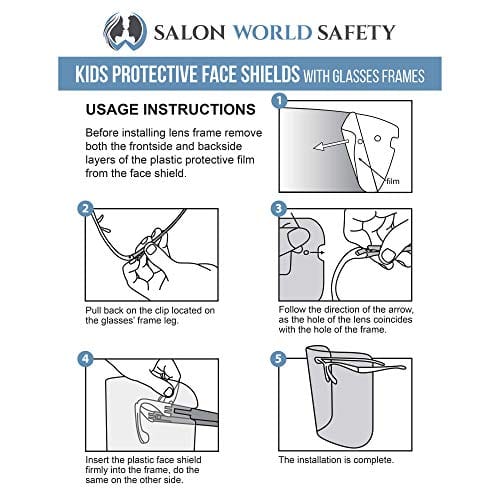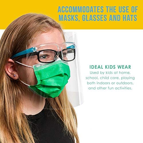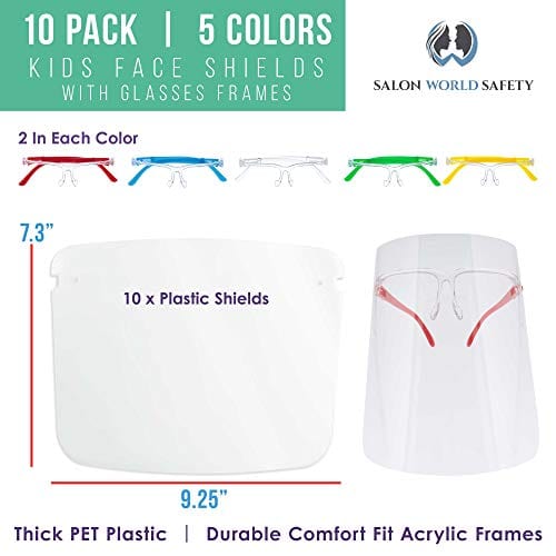 - 10 Pack of Kids Face Shields with Glasses Frames: Includes 10 kids face shields, 2 each of 5 colors (green, yellow, blue, red and clear) internally mounted comfort fit acrylic glasses frames that kids will love! Sanitary, durable, lightweight, and comfortable premium protective face shields made with ultra-clear thick plastic. Wear the face shields just like you would when wearing glasses over your ears and on your nose bridge. Wear your eyeglasses underneath.