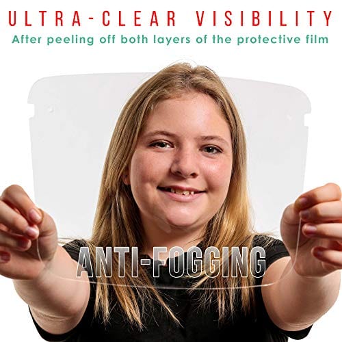 - Ultra-Clear and Anti-Fogging: Face shields provide super clear visibility and have superior optics that let in the maximum amount of light, while the anti-fogging material resists fog under extended use. The shield is crystal clear, after peeling off both layers of the protective film. Reusable after disinfecting. Some assembly required.